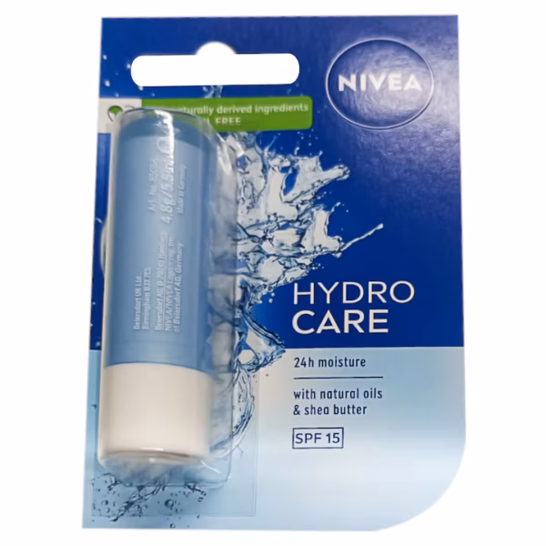 Balsam de buze hrănitor SPF15 Hydro Care de la Nivea, în ambalaj de 4,8 g, este un produs esențial pentru îngrijirea buzelor, oferind protecție și hidratare.