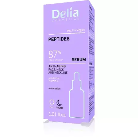 Serul Peptides Antiage de la Delia Cosmetics este un produs concentrat, destinat îngrijirii pielii mature, cu semne de îmbătrânire. Formula sa conține peptide, pantenol și vitamina C, având efecte vizibile asupra fermității, elasticității și uniformității tonului pielii.